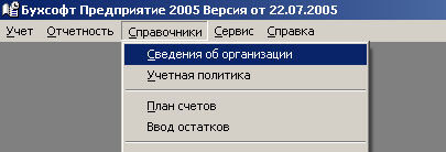 Начать работу в программе рекомендуется с заполнения справочников «Сведения об организации» и «Учетная политика», а также настройки плана счетов. По данным справочников осуществляется настройка организации бухгалтерского учета, структура бухгалтерии, закладываются исходные данные для автоматического формирования проводок и заполнения отчетности.