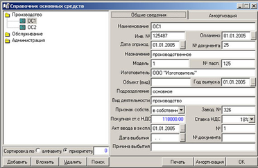 Для заполнения пунктов «Применение специальных коэффициентов», «Амортизацию не начислять по видам имущества», «Пониженные нормы амортизационных отчислений» в обязательном порядке должны быть заполнены справочники Основных средств и Нематериальных активов. По этим пунктам при нажатии кнопки справа вызывается форма, в которую может быть добавлен или удален объект ОС. Одновременно предлагается выбрать основание, по которому к этому объекту применены особые условия амортизации.