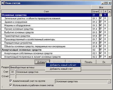 К имеющемуся списку счетов (субсчетов) можно добавить новые счета (субсчета), использующиеся в организации (используя кнопку «Добавить»). Удалить или изменить уже имеющиеся счета или субсчета нельзя в следующих случаях: