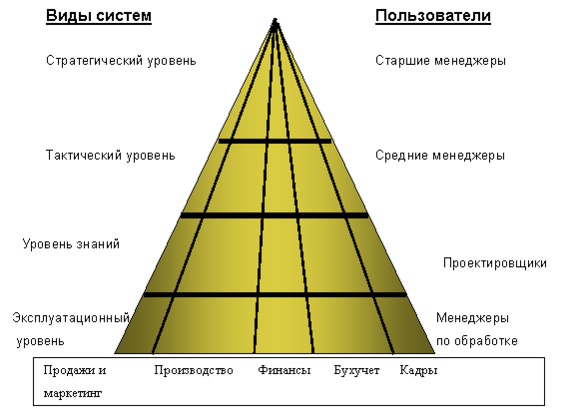 Организация имеет исполнительные системы поддержки выполнения — Executive Support Systems (ESS) на стратегическом уровне; управляющие информационные системы — Management Information Systems (MIS); системы поддержки принятия решений — Decision Support Systems (DSS) на управленческом уровне; системы знания — Knowledge Work Systems (KWS); системы автоматизации делопроизводства — Office Automation Systems (OAS); на уровне знаний; системы диалоговой обработки запросов — Transaction Processing Systems (TPS) на эксплуатационном уровне.