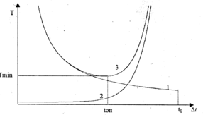 Задача поиска оптимального режима работы авпо сводится к минимизации правой части (9), решением является оптимальный интервал между запусками авпо tопт при времени работы авпо, равном тmin (рисунок).
