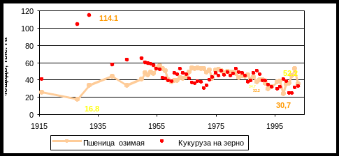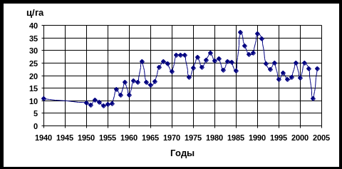 Со временем структура посевных площадей сельскохозяйственных культур изменялась и уже к 1980 г. площадь под озимую пшеницу увеличилась до 50 тыс. га, что превысило на 10 тыс. га площади посевов, занимаемых кукурузой. За период 1996 – 2004 гг. площадь под озимую пшеницу занимает 23,6 – 52,2 тыс. га, что составляло 13,4 – 29 % от всей посевной площади. Анализируя динамику урожайности озимой пшеницы за период 1940 – 2005 гг., можно отметить, что наиболее высокий уровень урожайности 36-37 ц/га был в 1986 – 1990 гг. (рис. 2).