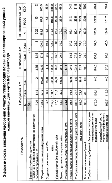 Для этих целей нами разработана электронная таблица в приложении Excel, позволяющая автоматизировать расчеты потребности необходимых доз удобрений под запланированную урожайность интенсивного сорта зерна. Удобство ее эксплуатации позволяет за короткий период исследовать потребность в питательных веществах различных сортов зерновых культур на полях с различным биохимическим анализом почвы. В разработанную нами электронную таблицу введены данные по планируемой урожайности сорта на удобренном фоне, результатам биохимического анализа почвы в сравнении с лучшими показателями районированных сортов с ближайших ГСУ.