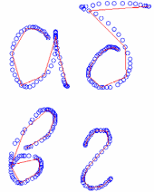 Рисунок 3 - Изображения обучающих символов. Линией обозначены выбранные точки, окружностями - введенные