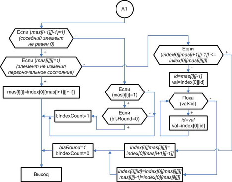 После успешной проверки граничных условий, происходит выполнение подфункции А1 и (или) А2 и (или) … А5. На рисунке 2 приведен алгоритм работы подфункции А1. Отличие А2 … А5 заключается в индексах массива. Подфункции выполняют проверку соседних элементов проверяемого пикселя, и производят заполнение индексированного массива. Проверка производится 1, 2, 3 и 4го пикселей (2).