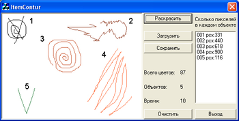 На рисунке 4 приведен интерфейс программы, в которой реализован описанный алгоритм. Основную часть программы занимает графическое окно, в котором можно нарисовать объекты. Предусмотрен интерфейс сохранения и загрузки изображения. Приводятся основные параметры выполнения алгоритма: время выполнения, количество объектов, количество отдельных цветов (переменная index_count) а также количество пикселей в каждом объекте. Каждый распознанный объект выделяется уникальным цветом.