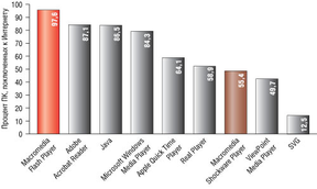 Технология Macromedia Flash становится все более популярной среди Web-специалистов. Вначале Flash-технологии использовались преимущественно для создания различных анимированных баннеров и заставок, затем большую популярность приобрели Flash-игры и короткие анимационные Flash-ролики. Параллельно с этим активно развивались онлайновые интерактивные бизнес-приложения: руководства пользователя, рекламные презентации, средства обучения и т.п. Все чаще технология Flash стала применяться для создания сложных интерактивных сайтов и, по сути, в последние годы превратилась в промышленный стандарт для работы с интерактивным контентом. Одно из главных удобств Flash, принесшее этому продукту широкую популярность, — обеспечение принципа «Build once, deliver anywhere» («Разработал единожды, распространяй везде»). Приложения, созданные на базе Flash, работают на разных платформах Windows, Macintosh, UNIX, PDA и даже в мобильных телефонах. Продукт Macromedia Flash Player фактически стал стандартом и сегодня установлен на компьютерах 97,6% пользователей Интернета (рис. 1).