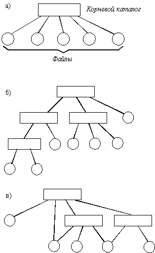 Рис. 2. Логическая организация файловой системы а - одноуровневая; б - иерархическая (дерево); в - иерархическая (сеть)