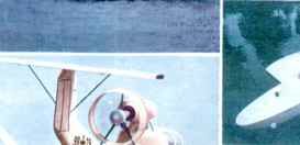 | Одинадцатиметровый экраноплан "Йорг - IV" над боденским озером. Аппарат оснащен 218-сильным двигателем, работающим на толкающий пропеллер, и способна поднять 1.7т груза. Воплавающие птицы при взлете инстинктивно используют эффект воздушной подушки. Создатели экранопланов используют тот же эффект. В полете над Балтийским морем экраноплан Х-114 достиг высоты 70м Г. Йорг готовится к старту | |
