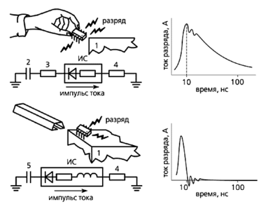Непосредственно перед разрядом и в течение первых десятков наносекунд разряда устройство попадает под наведенное высокое напряжение, т.е. на изделие действует и потенциал электрического заряда, и ток разряда. В итоге у полупроводниковых приборов и ИС могут иметь место два типа повреждений: