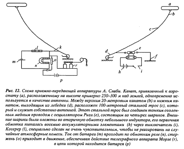 А. Слаби улучшил аппаратуру: он использовал в качестве передатчика искровой индуктор (катушку Румкорфа), так чтобы его искровой промежуток располагался в антенном контуре, индуктивно с ним связанном. Когерер же и соответствие антенного провода различным частотам были также последовательно улучшены (рис. 12) [38].