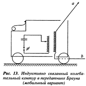 Институализация инженерной деятельности в области радиотехники осуществлялась лишь после изобретения радио, когда начала формироваться новая отрасль промышленности. Эта деятельность была направлена на разработку конструктивных вариантов радиотехнических устройств. Она дала толчок к появлению радиотехнической теории, обозначившему начало собственной истории радиотехники. С этого времени она становится связанной в основном с развитием новых схем радиотехнических устройств (например, схема с заземленной сеткой, рефлексная система, супергетеродинный приемник и т. д.). Фердинанд Браун положил начало деятельности именно такого рода. "Передатчик для беспроволочной телеграфии должен был удовлетворять двоякому требованию: прежде всего, в нем должен был возникать по возможности сильный высокочастотный переменный электрический ток, чтобы затем то же самое произошло и с излучением, т.е. электромагнитными волнами. Передатчик Маркони, который в противоположность конденсаторному контуру представляет собой не "закрытый", а "открытый" колебательный контур, превосходно излучает (радиоволны. - В. Г.). Конденсаторный контур, который сам практически ничего не излучает, напротив, с точки зрения создания сильных токов высокой частоты намного превосходит открытый колебательный контур. На основе объединения обеих схем и возник знаменитый передатчик Брауна. [...] Аналогичная двойственная задача возникает и перед приемником. Прежде всего пришедшие от передатчика электрические волны должны быть приняты, причем они должны быть преобразованы в высокочастотные токи, которые затем со своей стороны вызывают воспроизведение знаков в телефоне или записывающем устройстве. И здесь тоже для приема волн нужен подвешенный провод, как это превосходно и аналогичным образом сделали Попов и Маркони. Однако он в меньшей степени подходит для целевого использования полученной энергии, для чего, как распознал Браун, лучше всего подходит конденсаторный контур. Именно таким образом с помощью соединения этого провода с одним или многими конденсаторными контурами и возник связанный приемник Брауна" [41] (см. рис. 13) [42].