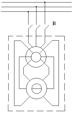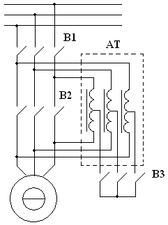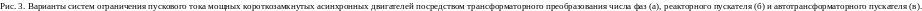 Основными объектами примененния АДКСП являются машины и механизмы с герметичным электроприводом. Однако при использовапнии рассмотреных выше конструктивных преобразований и оптимизации геометрических соотношений активной части электромеханического и индукционного преобразовательного элементов системы, технические решения АДКСП (рис. 3,а ) могут составить конкуренцию традиционной конструкции мощного короткозамкнутого АД с многовитковой стержневой обмоткой и индукционным реакторным Р (рис. 3, б) или автотрансформаторным АТ (рис. 3, в) пускателем с группой выключателей В1...В3.