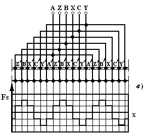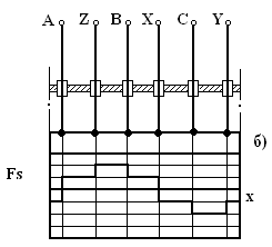 Для реализации рассмотренной возможности снижения числа отводов или герметичных вводов в электромеханическую часть, необходимо решение задачи улучшение гармонического состава МДС статора АДКСП с q = 1. Указанная задача решается разделением каждой фазы ТП или ПП на входе в статор на части (долевые стержни), размещением этих частей в отдельных пазах и замыканием автономными короткозамыкающими кольцами (рис. 2, а) 6. Например, разделение каждого отвода от фазных гермовводов на четыре части (развертка короткозамкнутой обмотки на рис. 2, б), в соответствии со звездой (рис. 1, а) создает структуру Fs(x) (рис. 2, в), эквивалентную структуре МДС 24 – пазового статора традиционного АД.