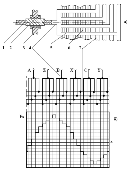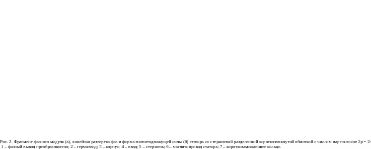 Поэтому преобразовательная часть АДКСП должна содержать шестифазную (шестистержневую) вторичную обмотку, позволяющую создать двух (рис. 1, б), четырех или шестиполюсную (рис. 1, в) волну вращающейся МДС статора Fs(x) при наличии соответственно 6, 12 или 18 герметичных отводов.