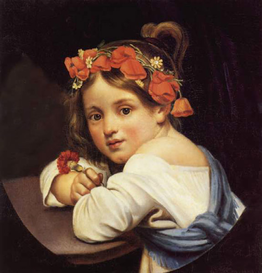 Картина Кипренского «Девочка в маковом венке с гвоздикой в руке (Мариучча)». 1819. ГТГ. Масло, масло. 42,5X40,9 (круг в прямоугольнике). Государственная Третьяковская галерея, Москва. Инв. № 5851