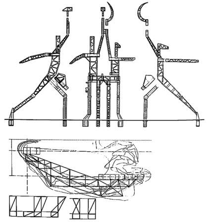Осталась самая ответственная и сложная часть - летящий по воздуху шарф: огромная дуга его имела только две точки касания со статуей; она отходила между двумя торсами и, пролетев по горизонтальной окружности тридцать метров, схватывалась рукой девушки. Каркас-ферма, державшая шарф, необычайно сложная и прихотливая, не имела прецедентов в прошлом; честь ее сооружения принадлежит инженерам Дзержковичу и Прихожану. Эту ферму Мухина назвала "загогулиной", так ее теперь все и звали. И вот с монтажом "загогулины" не ладилось: несколько раз ее снимали с места, снова и снова проверялись крепления и усиливалась ее прочность. Сроки кончались, работа шла днем и ночью, никто не уходил с рабочей площадки домой.