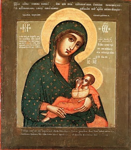 Приими, Госпоже Богородительнице, слезная моления рабов Твоих, к тебе притекающих. Зрим тя на святей иконе во чреве носящую Сына Твоего и Бога нашего, Господа Иисуса Христа. Аще и безболезненно родила еси Его, обаче матерния скорби веси и немощи сынов и дщерей человеческих зриши. Темже тепле припадающе к цельбоносному образу Твоему, и умиленно сей лобызающе, молим Тя, всемилостивая Владычице: нас грешных осужденных в болезнех родити и в печалех питати чада наша, милостивно пощади и сострадательно заступи, младенцы же наша, такожде и родившия их, от тяжкаго недуга и горькия скорби избави. Даруй им здравие и благопомощие, да и питаемии от силы в силу возрастати будут, и питающия их исполнятся радостию и утешением, яко да и ныне предстательством Твоим из уст младенец и ссущих Господь совершит хвалу Свою. О Мати Сына Божия! Умилосердися на матери сынов человеческих и на немощныя люди Твоя: постигающия нас болезни скоро исцели, належащыя на нас скорби и печали утоли, и не презри слез и воздыханий рабов Твоих. Услыши нас в день скорби пред иконою Твоею припадающих, и в день радости и избавления прийми благодарная хваления сердец наших. Вознеси мольбы наша ко престолу Сына Твоего и Бога нашего, да милостив будет ко грехом и немощем нашим и пробавит милость Свою ведущим имя Его, яко да и мы, и чада наша, прославим Тя, милосердную Заступницу и верную Надежду рода нашего, во веки веков.