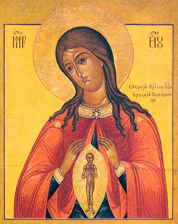С древнейших времен в минуты жестоких страданий, связанных с муками рождения детей, женщины прибегали с горячей молитвой к Пресвятой Богородице. Вера в всесильное заступничество Пречистой Девы, Которая Сама была Матерью, за страждущих рожениц побудила к созданию в русской иконографии ряда икон, связанных с образом чревоношения Богородицей Младенца Христа. Таковыми являются три образа Богоматери с характерными названиями - «Блаженное Чрево», «Помощница в родах» и «Слово плоть бысть».