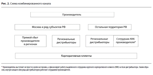 Вариантом решения может быть создание комбинированного канала сбыта. В этом случае объединяют две концепции дистрибуции: в структуру непрямого канала сбыта включают прямых продавцов и технологии работы с крупными клиентами, созданное производителем (рис. 2).