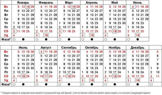 Нельзя не признать огромного влияния Луны на множество происходящих процессов на Земле, особенно связанных с жизнедеятельностью растений и животных. Влияние Луны особенно бывает сильно в Полнолуния и Новолуния. Также и Первая, и Последняя четверти, как правило, не проходят незамеченными для земной флоры и фауны. Давно замечено, например, что в Полнолуния психическая составляющая человека наиболее уязвима. Человек Разумный это заметил очень давно и старался применить это знание в устройстве своей жизни в ритме фаз Луны, сообразуя с ними свою деятельность. В идеале это давало бы очень большое удобство как психологического так и практического плана. Ведь если бы каждый календарный месяц начинался с Новолуния, а каждая новая неделя начиналась (или заканчивалась) одной из фаз Луны, то каждый бы знал, когда нужно сеять, когда – жать, а когда и отдыхать. Это бы стало частью человеческой культуры. Если Вы прочтёте замечательную книгу И.А.Климишина «Календарь и хронология» , вы узнаете, что из-за присущей Луне неравномерности движения (в проекции на Земного наблюдателя), все попытки сгармонизировать Лунный и Солнечный циклы в едином календаре после многочисленных попыток привели лишь к тому, что одна двенадцатая часть года оказалась названа в честь Луны месяцем, а его (месяца) примерно четвёртая часть выделена как неделя, согласно (опять же примерно) фазам Луны. Приемлемый по качеству Лунно-Солнечный календарь, сочетающий в себе незыблемость солнечного года с полезностью разбивки года на месяцы и недели до настоящего времени создан так и не был. Более того, работы над его созданием уже давно прекращены как бесперспективные. Однако, как вы увидите далее, при некоторых условиях, привнесённых современной цивилизацией совсем недавно, идея использования Лунно-Солнечного календаря уже не кажется столь безумной, как это могло быть ранее. Расчёт Календаря достаточно прост. Основная идея его состоит в том, чтобы разделить учёт солнечных дней и Лунных фаз. Фазы Луны будут учитываться неделями (новыми, составляющими одну четверть от синодического Лунного месяца) с максимально возможной для Календаря точностью. Каждая неделя заканчивается (или начинается, в случае использования европейского порядка дней недели) какой-либо фазой Луны, попадающей на «красные» дни, которые, как наиболее напряжённые, могли бы рекомендоваться как выходные. Главное при рассмотрении расчёта – не путать дни солнечные (равные суткам), определяющие непосредственное течение времени, и дни лунные, в нашем случае определяющие дни недели как фазы лунного месяца.