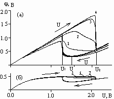 На рис. 3 представлены зависимости потенциала в различных точках анода (а) и катода (б) от приложенного напряжения при скорости пуска V=36 В/час. Стрелками указаны решения при прямой и обратной развертке напряжения. На участке U1
