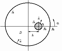 Рис. 2. Схема электрохимической системы. Sa – защищаемая поверхность; Sk – поверхность катода; Ra, Rk – радиусы анода и катода; h – расстояние между центрами электродов;
