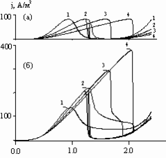 На рис. 4 представлены зависимости плотности тока от напряжения в точках электродов, наименее удаленных друг от друга: (а) – в анодной точке