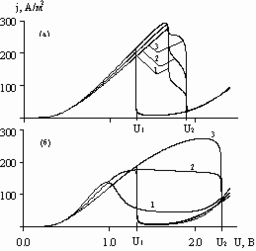 На рис. 5 представлены зависимости плотности тока от напряжения в трех точках катодной границы при различных h. Из рисунка видно, что при увеличении h: 1) максимальная плотность тока в точке, наиболее близкой к аноду, падает (линия 1); 2) максимальная плотность тока в наиболее удаленной от анода точке (линия 3) практически не меняется; 3) напряжение U1 (переход анода в активное состояние при обратной развертке) от h практически не зависит; 4) напряжение U2 (переход анода в пассивное состояние при прямой развертке) - значительно увеличивается.