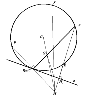 Если АВ - хорда окружности, а - касательная к ней в точке В и перпендикуляры из точки А к прямой а из точки В у прямой АВ пересекаются в точке Н, то точки Е, F и K, симметричные Н соответственно относительно а, В и середины АВ, принадлежат данной окружности (рис.5).