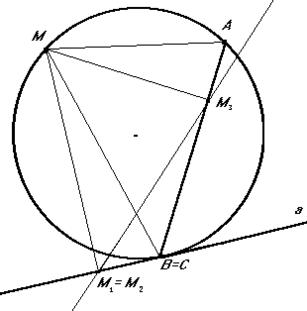 Чтобы выяснить положение прямой Симпсона, обратимся к рис.6. Так как РММ1В = РММ3В = 900 , то точки М1 є М2 и М3 принадлежат окружности диаметра МВ. Следовательно, если А=В, то прямая М1М3 Симпсона будет касательной в точке М1 к окружности диаметра МА=МВ (рис.7).