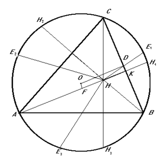 K = D+F, D = (В+C)/2, F = (A+H1)/2 и, значит, K = (B+C+А+H1)/2 = (H+H1)/2 , т.е. Н1 симметрична точке Н относительно прямой ВС. Для точек Н2 и Н3 доказательство аналогично.