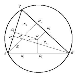 Таким образом, точки Оi и Кi (i =1, 2 ,3) симметричны относительно L, т.е. принадлежат окружности с центром L и радиусом, равным половине радиуса R описанной окружности, так как LO12 = LK12 = (±A/2)2 = R2/4. Углы ОiHiKi ( i=1, 2, 3) прямые и опираются на диаметры полученной окружности, а поэтому точки Hi этой окружности принадлежат. В дальнейшем остановимся на применении рассмотренных фактов к вырожденным треугольникам, т.е. таким треугольникам, у которых совпадает две или три вершины.