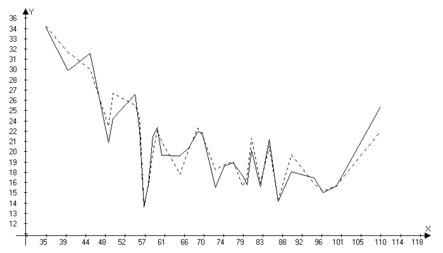 Рис. Зависимость ошибки обобщения (процент неправильно решённых примеров тестового набора данных) от числа нейронов в скрытом слое нейросети (сплошной линией показан результат эксперимента, штриховой линией значения волнового критерия).