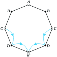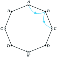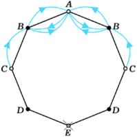 7 (М595). В вершине A правильного восьмиугольника сидит лягушка. Из любой вершины восьмиугольника, кроме вершины E, противоположной A, она может прыгнуть в любую из двух соседних вершин. Попав в E, лягушка останавливается и остаётся там. Найти количество em различных способов, которыми лягушка может попасть из вершины A в E ровно за m прыжков.