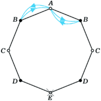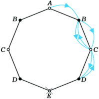 Если раскрасить вершины восьмиугольника через одну в чёрный и белый цвет (рис. 2), сразу станет ясно, что e2k–1 = 0 при любом k: цвет вершин при каждом прыжке меняется. Обозначим через an и cn количество способов, которым лягушка может за 2n прыжков, попасть из вершины A, соответственно, в вершину A и в одну из вершин C (из соображений симметрии ясно, что в каждую из вершин, обозначенных на рисунке буквой C, можно попасть одним и тем же числом способов). Как легко проверить (см. рис.2а,б,в,г),