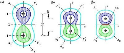б) после смещения проводников на расстояние dl друг к другу. А1А2 - новая сепаратриса; Ф1Ф2 - пересоединенный магнитный поток. Он стал обшим потоком двух токов; линия X проходит перпендикулярно плоскости рисунка;