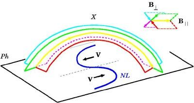 Рис. 4 - Модель магнитного поля активной области перед вспышкой. Особая линия магнитного поля - сепаратор (Х) над S-образным изгибом фотосферной нейтральной линии (NL) подобен радуге над рекой. Вихревое течение со скоростью V в фотосфере деформирует фотосферную нейтральную линию так, что она приобретает форму буквы S. V_ - конвергентные фотосферные течения (направленные к нейтральной линии); V|| - сдвиговые фотосферные течения (направленные вдоль нейтральной линии). В правом верхнем углу показана структура поля в окрестности сепаратора, вблизи его вершины: B_ - поперечные составляющие поля (перпендикулярные сепаратору), B || - продольная составляющая поля (направленная вдоль сепаратора).