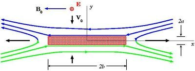 2в - ширина слоя; 2а - толщина слоя; стрелками показаны направления втекания плазмы в слой и вытекания из него.