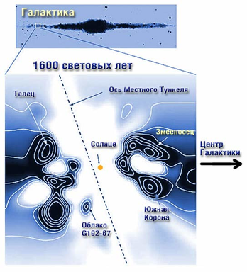 Сечение Местного Туннеля плоскостью, перпендикулярной диску Галактики. Более плотные и холодные области показаны темным цветом. Раскаленный газ массой порядка 1000 М¤, заполняющий Туннель, буквально заливает его потоками мягкого рентгена, излучая 5х1036 эрг в секунду. Представьте себе: удельная светимость этого разреженного газа такая же, как у Солнца, в котором идут термоядерные реакции! Астрономы с пристрастием ищут того, кто эту энергию в него "закачал".
