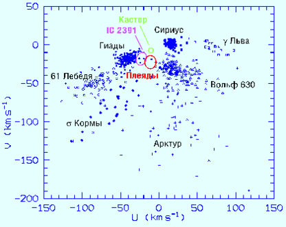Диаграмма скоростей смещения звезд в окрестности Солнца, в проекции на галактическую плоскость. Положение звезд выражены в прямоугольных координатах X, Y, Z (в начале координат Солнце), оси которых направлены, соответственно, в центр Галактики, в сторону галактического вращения и в направлении северного полюса Галактики. Скорости звезд относительно Солнца в этих координатах обозначают буквами U, V, W. Первые две компоненты скорости, отраженные на диаграмме, хорошо иллюстрируют идею Эггена выделения звездных потоков. К примеру звезды потока Гиад почти не отстают от галактического вращения в окрестности Солнца (фактически, у них нормальная скорость вращения, учитывая, что Солнце само обгоняет соседей на 12-15 км/с в направлении Y), зато ощутимо удаляются от центра Галактики (U порядка -40 км/с). Эллипсы отмечают скоростные характеристики еще трех известных групп нашего неба.