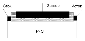 Иногда его называют также МОП-транзистором (транзистор со структурой металл-окисел-полупроводник). На кремниевую пластину, имеющую дырочную проводимость, наносится слой окисла SiO2 (поверхность окисляют). С двух сторон вжигаются электроды, которые называются истоком и стоком. Поверх окисла напыляется слой металла и приваривается электрод. Эта часть устройства называется затвором.