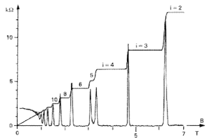 Зависимость холловского сопротивления от величины приложенного магнитного поля. Кривая с острыми пиками - это зависимость омического сопротивления образца от магнитного поля. Как следует из графика, сопротивление каждый раз обращается в нуль, когда квантовый эффект Холла выходит на плато