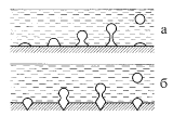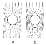 При малых размерах наблюдается ламинарное течение: вода течет спокойно, послойно (рис.4а). Для скорости всплытия vлам выполняется формула Стокса: