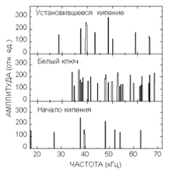 3. Измерение спектрального состава шумов, сопровождающих различные стадии кипения, показало, что шумы на стадии "белого ключа" связаны с образованием в объеме воздушных пузырьков размерами 35-50 мкм.