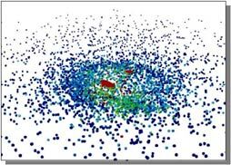 Рис. 7 – После образования двух горячих зародышей (красные пятна), значительная часть более холодного (зеленый и синий цвет) материала исходного облака частиц остается в окружающем пространстве (размеры частиц увеличены).