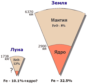 Рис. 5 – Сравнительное содержание железа (Fe) и окиси железа (FeO) в Земле и Луне.