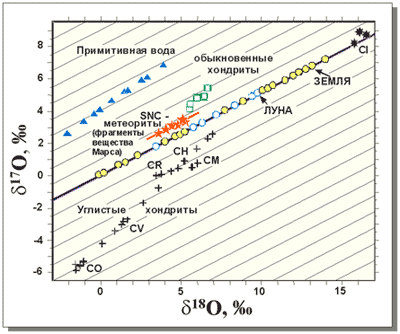 Рис. 6 – Диаграмма отношений изотопов кислорода δ17О и δ18О (δ17О и δ18О – величины, характеризующие сдвиги изотопных отношений кислорода 17О/16О и 18О/16О, относительно принятого стандарта SMOW). На этой диаграмме образцы Луны и Земли ложатся на общую линию фракционирования, что указывает на генетическое родство их состава.