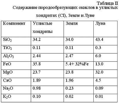 Примечание: Ядро Земли (учтена его масса, составляющая 32% массы планеты) содержит, помимо железа никель и другие сидерофильные элементы, а также до 10% примеси легких элементов. Это могут быть кислород, сера, кремний, с меньшей вероятностью - примеси других элементов. Данные для Луны взяты по С. Тейлору (1979). Оценки состава Луны сильно варьируют у разных авторов. Нам представляется, что оценки С. Тейлора наиболее обоснованы (Галимов, 2004).
