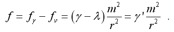 Структура формулы, характеризующей газодинамическое отталкивание, выглядит аналогично выражению для гравитационной силы, если вместо λ подставить γ - гравитационную постоянную. Строго говоря, полного подобия этих сил нет, так как гравитационное взаимодействие является дальнодействующим, а отталкивающая сила испарения – локальной. Тем не менее, в первом приближении их можно объединить: